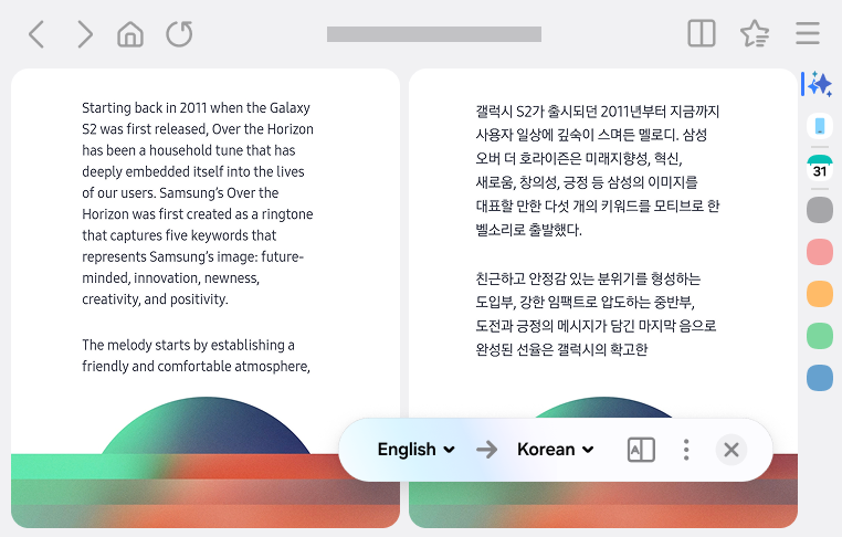 Tra le funzioni AI citate rientrano anche strumenti per la produttività e la comprensione dei contenuti. Samsung Browser consente di ottenere riassunti e traduzioni in tempo reale direttamente all’interno dell’app, evitando di copiare e incollare testi su servizi esterni.